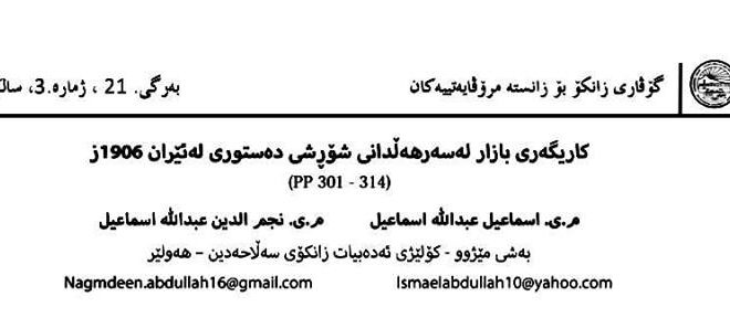 توێژینەوە لەدوا ژمارەی گۆڤاری زانکۆ بۆ زانستە مڕۆڤایەتییەکان .. بەرگی 21 ، ژماره 3 ، سالى 2017 م.ى. اسماعیل عبدالله اسماعیل ، م.ی. نجم الدین عبدالله اسماعیل كاریگەری بازار لەسەرهەڵدانی شۆڕشی دەستوری لە ئێران 1906 لینكی داگرتن